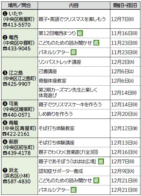 申込:【直】マークのない講座は申し込みが必要。詳細はホームページまたは施設に確認(受講対象年齢が設けられている講座あり)