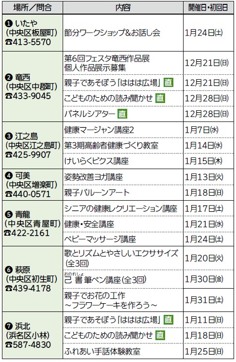 申込:【直】マークのない講座は申し込みが必要。詳細はホームページまたは施設に確認(受講対象年齢が設けられている講座あり)